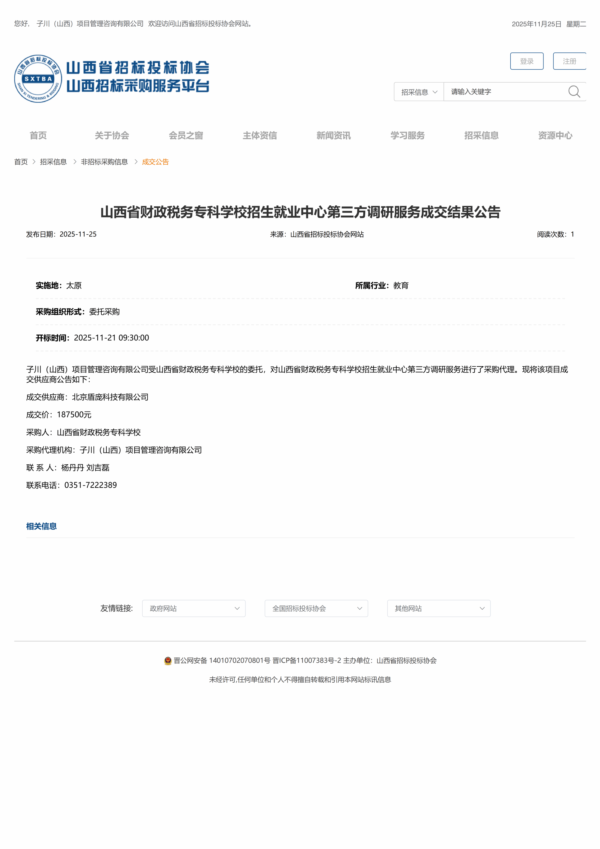 2025年11月17日,子川(山西)项目管理咨询有限公司受我校委托,对我校“招生就业中心第三方调研服务”项目进行招标采购。 并于2025年11月25日完成评审工作。 山西省招标投标协会网关于本项目成交结果公告如下: